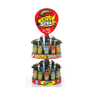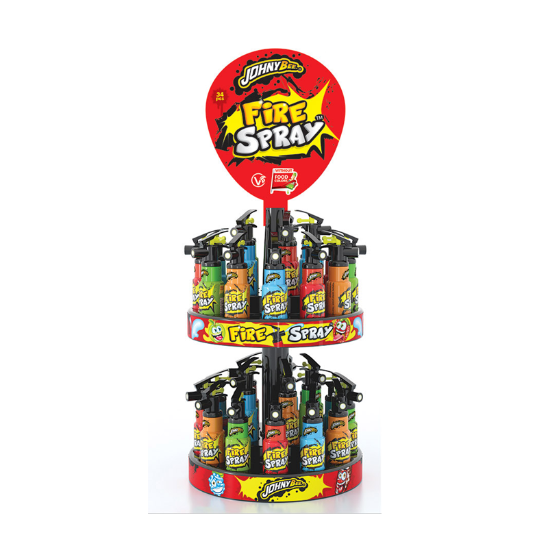 Fire Spray ofrece caramelos líquidos en spray con sabores ácidos a fresa, frambuesa, manzana y cola. Cada mini extintor de plástico con pulverizador contiene 25 ml de producto y mide 11 cm de altura. Incluye un expositor giratorio con 34 unidades, perfecto para atraer la atención en cualquier punto de venta.