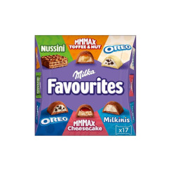 Deléitate con Milka Favourites en su formato de 158gr, una selección de bombones irresistibles con sabores como Oreo, Nussini, MMMAX y Milkinis envueltos en el característico chocolate suave de Milka. Perfectos para compartir o disfrutar en un momento especial.