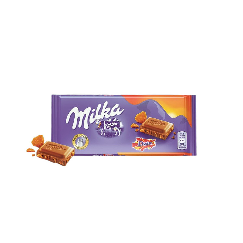Esta tableta no solo destaca por su sabor, sino también por su combinación de texturas. Los trozos de Daim, con su estructura dura pero caramelizada, aportan ese contraste perfecto con el chocolate Milka tan reconocible. La armonía entre dulzura y cremosidad es lo que convierte a esta tableta en una de las más especiales de la gama Milka.