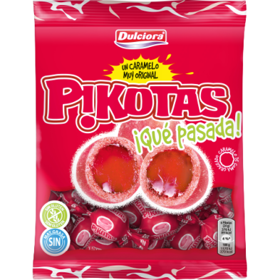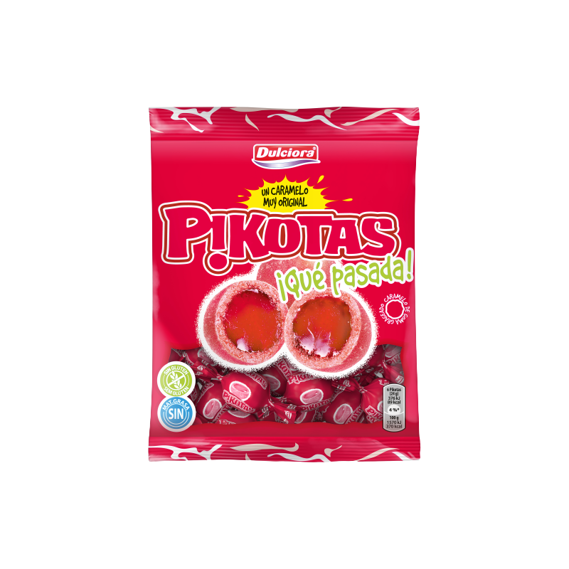 Descubre las Pikotas originales: caramelos de goma con un intenso sabor a cereza, rellenos de suave gelatina y cubiertos de azúcar. Ideales para disfrutar y compartir, vienen en una práctica bolsa de 100 g con envoltorios individuales que garantizan frescura y comodidad. ¡Irresistibles!
